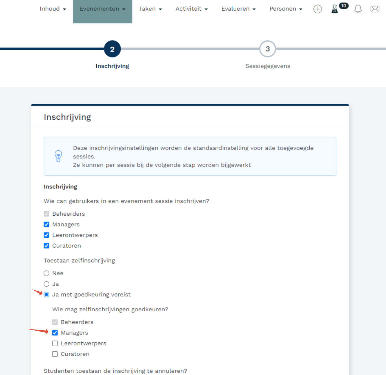 Je kunt de inschrijving bij een evenement op verschillende manieren instellen, waaronder de mogelijkheid om de lerenden zelf te laten inschrijven en dat er goedkeuring door iemand nodig is.