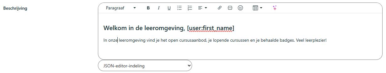 <h1> <span lang="en" class="multilang">Welcome to the learning environment, [user:first_name] </span> <span lang="nl" class="multilang">Welkom in de leeromgeving, [user:first_name] </span> </h1> <p> <span lang="en" class="multilang">In our learning environment, you'll find the open course catalog, your ongoing courses, and your earned badges. Enjoy your learning journey!</span> <span lang="nl" class="multilang">In onze leeromgeving vind je het open cursusaanbod, je lopende cursussen en je behaalde badges. Veel leerplezier!</span> </p>