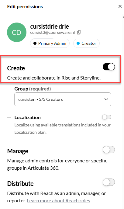 In het scherm wat dan open klapt kun je het vinkje "Create" aanzetten om dit teamlid Creator te maken of andere rechten toe te kennen of uit te zetten.