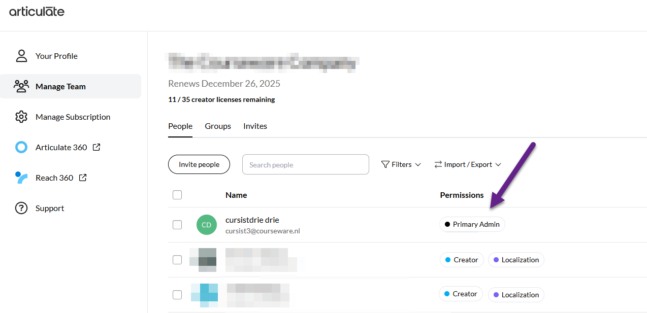 Wil je van admin wijzigen? Dit moet aangevraagd worden bij Articulate, stuur een mail naar sales@courseware.nl