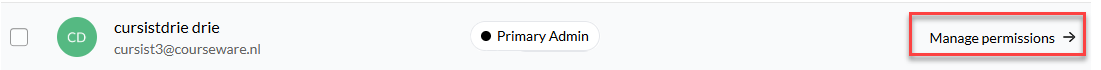 Wil je de admin ook Creator rechten geven of de rechten van een ander bestaand teamlid aanpassen, hover dan over de balk van het betreffende teamlid en dan verschijnt rechts "Manage permissions".